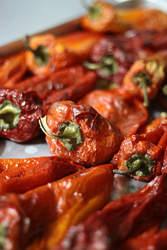 So you line up the peppers on the tray, let them roast and then sit down and sip your Turkish tea until they get cooled. If your kitchen is not a production line with trays of roasted peppers and many other tasks awaiting your attention you could fasten the process by placing the roasted peppers into a plastic bag, closing it for a while and then enjoying the easy peeling.