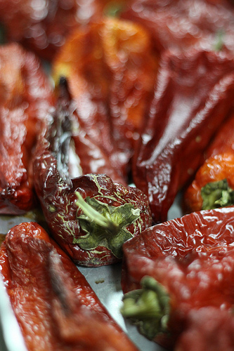 Eventually the deep red fat peppers would get roasted. And as they cool down we would peel them.One day I peeled about a hundred roasted red peppers. Made me feel like I was a doing a proper kitchen apprenticeship - you know, those painstakingly boring tasks that have little to do with cooking (or what novices think that cooking is) but build discipline and understanding of the real action at the kitchen.