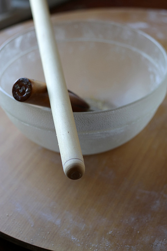 Once you rolled to about 1 cm you can start stretching the dough. Dust it well with flour. Start with the left bottom corner and “wrap” the dough tightly over the rolling pin as you move the pen towards the right upper corner. Place your palms in the middle and slightly shaking the rolling pin make the outward movements to the ends of the rolling pin and then back to the center.