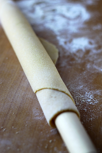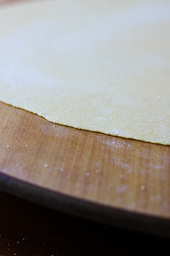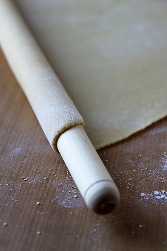 Unroll the dough and release the pin. Rotate the dough sheet and repeat the procedure. Continue until you will end up with rather thin dough. Here is the video that gives you an idea of what you should be doing.