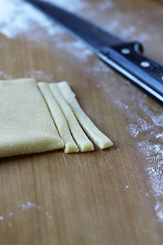 3. Form pasta: Dust the rolled sheet of dough with flour well, fold twice and cut with a sharp knife into thin strips to make tagliatelle. Mind you that when cooked the pasta will expand 1.5-2 times so you don’t want to cut your dough into very wide stripes. Unfold each piece and arrange on a large / a few kitchen towel(s) and dust with flour again.
