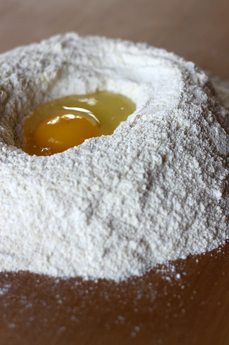 Then I use the technique from my grandma: with my fingers I first “whisk” the eggs in the middle to arrive to the mix you would use for omelet. I simply make circular movements with my fingers moving them further from the center as I go to get more flour into the mixture.