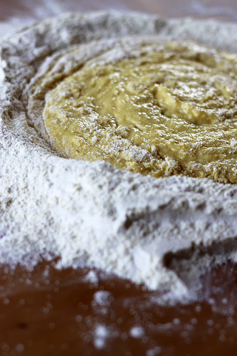 As you will include all the flour into the mixture and form the dough (I know that many would use pastry scraper or bench knife but I am just fine with my fingers) you can start kneading it. Because of semolina this dough is not so easy to knead so be prepared to put some work in to it.