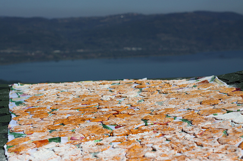 7 days later came Monday when at the breakfast we were discussing where to dry tarhana. Anne insisted tarhana should stay outside to ‘breath’ during the drying. Semiha abla argued it should not stay on the sun which would take away the vitamins. I challenged her by saying they dry it on the balconies in the South (why do I often myself coaching Turks about how they should go about Turkish food?). I suggested the roof of our restaurant - warmest place, right on the sun and no cats roaming around. We climbed and wrinkling our noses we divided the tarhana dough into the little patties which we flattened, bathed in flour and laid out in the old curtain. For a day our tarhana was enjoying all the unspent generosity of the autumnal sun. And the best view tarhana has possibly ever seen.