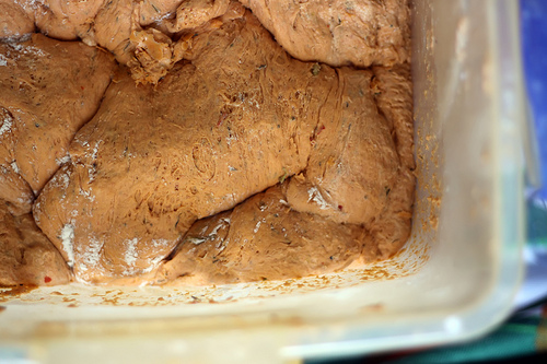 And then the beast of a dough started a life on its own. Only a few hours later it attempted to run away: it proofed so well that the containers that were twice as large as the volume of the dough turned out too tight to keep the dough tamed. We knocked the tarhana dough down, spread a cloth on the floor to catch any dough aspiring to run away.