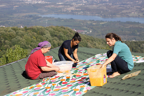 First, we put together the tarhana dough. Semiha abla, our helper installed a 50 liter metal caldron on the stove and inside went chopped onion, garlic, tomato, meat stock, fresh parsley, dill, dry mint. She took the cream she has been skimming from our homemade yoghurt (aygut): she was setting it aside and saving in the freezer the whole year. The mix was simmering on the stove for about an hour before it was taken off. Then came the fresh yoghurt which we make from the milk delivered on request by our neighbor who keeps a cow. Then the fresh yeast. Then the flour to form the dough. Making tarhana is the ultimate example of cooking without a recipe - ingredients go inside freestyle following general sense of proportion.