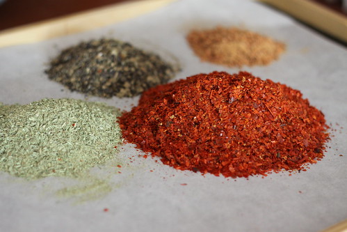 Anyway, the idea was clear: I’d make seasoning out of dry vegetable peels. So I started collecting the peels on a few baking trays - bulking together tomato peel and make sure to separate it from thicker peels such as eggplant’s so each dries separately. I was simply drying them outside throughout the October and it got colder here I started popping them in the oven after every baking (every day for us). Once the vegetable peels got dried - some sooner than the others - I ground them into flakes. I ended up not tossing in any salt to be more flexible in the use of the seasoning. My mother-in-law added coarse salt as well as dry mint and thyme - as she uses a lot of both - to one batch too. And I guess this is the beauty of making this seasoning virtually out of nothing (something you are about to throw away): experimentation has zero costs and you are bound to produce only something better.