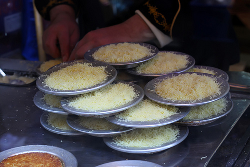 Künefe is prepared in the small round aluminum molds generously greased with butter. In the mold you arrange a layer of the chopped kadaıf, then a few pieces of soft cheese - Turkish dil peyniri would be a popular choice although originally soft cheese from Antakiya is used - and then a layer of kadaıf again. Once künefe is assembled you pour some (ok, I am understating here: there is nothing like “some”, “a bit” or “little” in the recipes of Turkish sweets) melted butter over and get to cooking. The cooking typically takes place on the charcoal and midway künefe has to be flipped over. Once done a generous ladle of sugar syrup is poured over the sweet and pistachio can be sprinkled on top. A few things in the world can compare with digging into künefe with a fork, cutting out a piece and lifting it as the melted cheese strands are extending all the way and you are biting through the warm, sweet and crispy vermicelli.