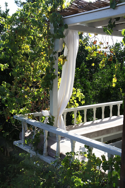 The terrace is wood and marble with curtains for shade and long divans along the perimeter where one can sit down for tea, linger with a book and sleep soaking in the dense air and sounds of the village night. The garden, baby of Chris, is blooming with citrus trees of all sorts, two olive trees giving enough fruit to make olive oil for the year ahead, fragrant herbs as well as a rooster and his chickens grazing around.