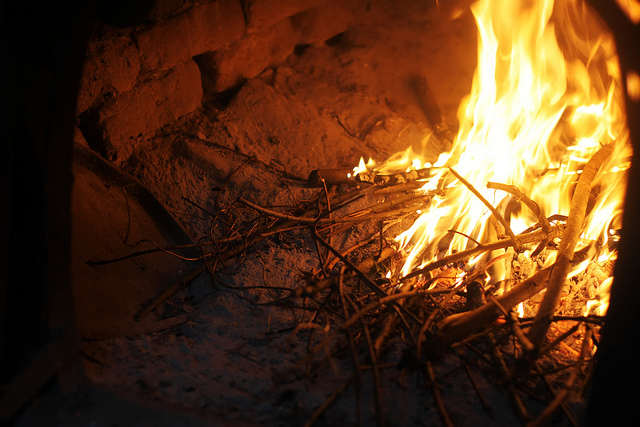 I left to look after the oven: the breads have proven in the small round trays and had to be baked soon. Me and Ahmet continued feeding the long fruit branches into the oven until his mother arrived with a bowl of milk followed by the participants. The rain stopped. Neriman Teyze immediately took over. She acted just like my mother-in-law (and often, myself): no one will do it quicker and better than me so you, girl, go and fetch that bowl. She inspected the breads and noted with satisfaction, ‘Güzel kabarmışlar’ (proved so well). She continued feeding logs in the oven. I asked her how she knew the oven was ready. She replied that she was waiting for the oven dome to turn white. And finally, it did - from the ashes of the burned woods. I sprinkled the breads with nigella seed (çörek otu, how we call it here), and she sent them to the oven one by one and then closed the oven with a well fitting metal screen.