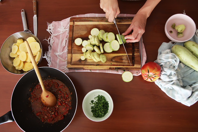 So it was in the Olives, Lemons and Za’tar where I found the recipe perfect for the time when summer slowly gives the stage to autumn. Humbly named “Baked Eggplant” the dish of siniyat el fokrra meaning “a tray for the poor” is an excellent way to use the summer produce in a way that’s nourishing and satisfying both in a warm afternoon and a chilly night. The “tray” includes baked vegetables (eggplants, zucchini, potato, tomato, you name it) laced with the herbed and spiced tomato sauce.