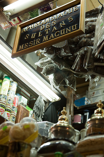 So here comes Mesir macunu, paste of 41 spices which — as one of the producers boldly states — «the Sultans used .. before taking part in harem activities». This wonderful paste apparently does boost one’s well-being, gives energy and improves sexual performance. What’s interesting is that the references to the aphrodisiac qualities of mesir macunu can be found only in non-Turkish sources. During the first months of my stay in Istanbul I was taken aback by the scene at a local herbalist. An Istanbul hamineffendi browsing the store addressed the shop keeper, «I have a slight cold, do you have something like Mesir macunu?»What? She was not buying it for her husband but to boost up her immune system?